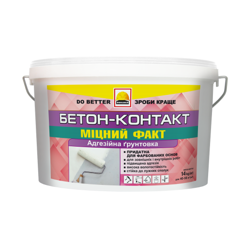 Адгезійна ґрунтова пігментована з додаванням кварцового піску для зовнішніх та внутрішніх робіт. Призначена для попередньої обробки мінеральних поверхонь: монолітного бетону, збірних бетонних виробів, глазурованої поверхні керамічних плиток, скла, гіпсокартону, пофарбованих фарбами алкіду поверхонь, а також металевих закладних елементів перед нанесенням на них гіпсових і цементних штукатурок, клею для плитки, ліпного декору. .