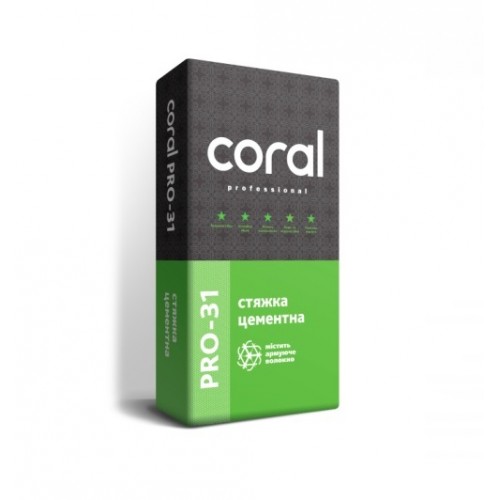 Армована суміш цементна Coral Pro-31 призначена для влаштування стяжок недеформуємих бетонних підлог всередині та ззовні будівель під фінішні покриття (керамічна плитка, природний камінь, лінолеум, ковролін, ламінат, паркет та інші), для підготовки основи під самовирівнюючі розчини. Рекомендована товщина шару від 20 до 80 мм. Може застосовуватися як підготовчий шар під систему «тепла підлога».