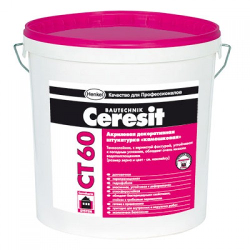 Штукатурка Ceresit СТ 60 призначена для влаштування декоративних тонкошарових штукатурних покриттів з «камінцевою» фактурою при внутрішніх і зовнішніх роботах, в т.ч. при обробці фасадів будівель, утеплених «легко-мокрим» способом з використанням плит з пінополістиролу, наприклад, системи Ceresit VWS. Оштукатурена поверхня має зернисту фактуру (у вигляді щільно укладених камінчиків). Ceresit СТ 60 випускається 163-х кольорів, включаючи білий, відповідно до карти колірних тонів компанії. Ceresit СТ 60 після висихання являє собою міцне і зносостійке покриття, здатне перекривати дрібні тріщини. Застосування штукатурки Ceresit СТ 60 інтенсивних, темних барв на фасадних системах утеплення має бути обмежена малими поверхнями (наприклад, окремими архітектурними елементами). Для обробки цоколя рекомендується використовувати «мозаїчну» штукатурку Ceresit СТ 177.