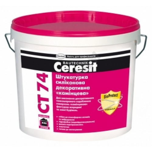 Штукатурка Ceresit CT 74 призначена для декоративного оздоблення всередині і зовні будинків бетонних, цегляних, оштукатурених, гіпсових основ, а також в системах утеплення фасадів.