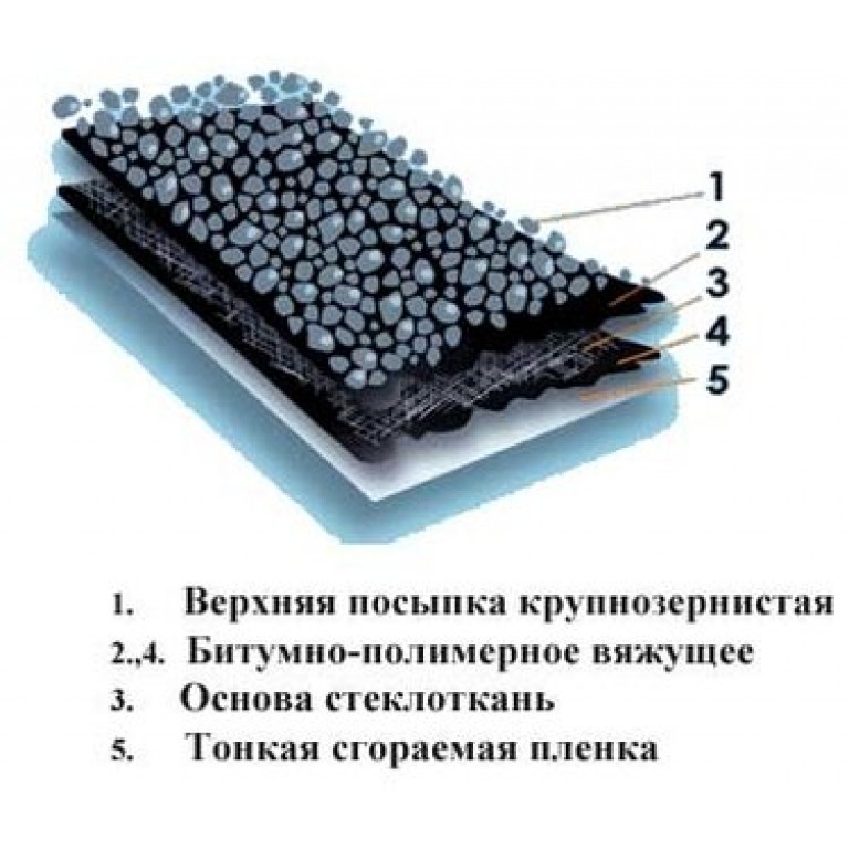 Гідроізоляційний матеріал в рулоні, складається з скловолокна і бітумного в'яжучого з грубозернистим посипанням. Для верхнього шару м'якої покрівлі.