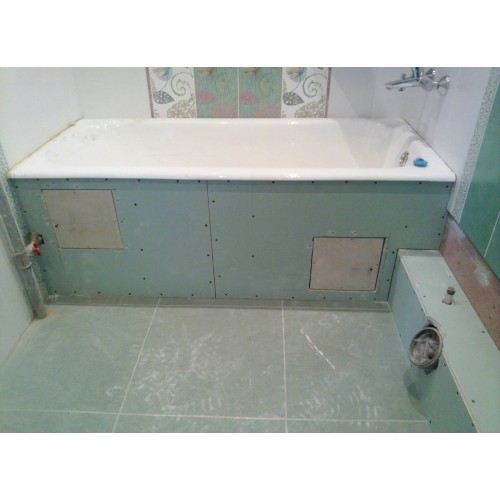 Листи вологостійкого гіпсокартону KNAUF (КНАУФ) 12,5 мм (1,2 * 2,5 м) мають прямокутну форму, складаються з двох шарів спеціального картону з прошарком з гіпсу з армуючими і гідрофобними добавками. Монтаж вологостійкого гіпсокартону не відрізняється від роботи з звичайним стіновим гіпсокартоном. Монтується каркас з металевого оцинкованого профілю, і до нього саморізами по металу кріплять гіпсокартон, вирізаний за розмірами. Відразу ж можна закладати шви шпаклівкою, грунтовкую, залишається тільки нанести декоративне покриття (шпалери, декоративна шпаклівка, керамічна плитка).