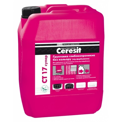Грунтовка Ceresit CT 17 супер призначена для зміцнення і просочення пористих, неміцних і сильно всмоктуючих основ (легкий бетон, штукатурки, гіпсові та цегляні поверхні), збільшення адгезії матеріалів Ceresit до основи. Особливо ефективна для підвищення міцності поверхневого шару дуже "слабких" основ; при відновленні фасадів будівель і споруд; для закріплення поверхні стін перед наклейкою тонкошарових шпалер і фарбуванням вододісперсійними фарбами; при необхідності збереження кольору оброблюваної поверхні основи.