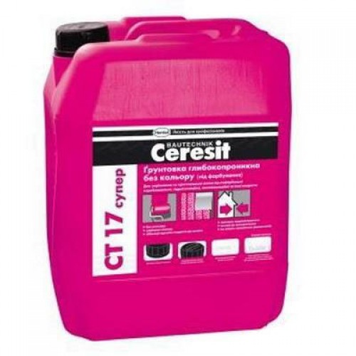 Грунтовка Ceresit CT 17 супер призначена для зміцнення і просочення пористих, неміцних і сильно всмоктуючих основ (легкий бетон, штукатурки, гіпсові та цегляні поверхні), збільшення адгезії матеріалів Ceresit до основи. Особливо ефективна для підвищення міцності поверхневого шару дуже "слабких" основ; при відновленні фасадів будівель і споруд; для закріплення поверхні стін перед наклейкою тонкошарових шпалер і фарбуванням вододісперсійними фарбами; при необхідності збереження кольору оброблюваної поверхні основи.