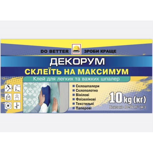 Професійний клей для легких та важких шпалер "Декорум" призначений для приклеювання склошпалер, склохолста, флізеліну, вінілових шпалер, паперових шпалер та інших шпалер. Готовий до використання. Наноситься на всі мінеральні поверхні, деревопохідні матеріали, раніше пофарбовані основи та інші поверхні.