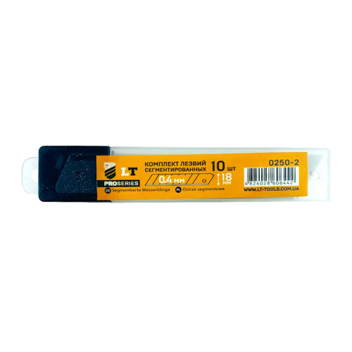 Комплект LT лез для ножів прорізнихЗмінні леза для канцелярських ножів виготовлені із сталі.Усі леза сегментовані, що дозволяє за першої необхідності зручно обломити затуплену частину леза вздовж лінії насічки.