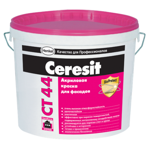 Акрилова фарба Ceresit CT 44 призначена для обробки поверхонь будівельних конструкцій та елементів всередині і зовні будинків. Зовні будинків - по мінеральних основах (бетон, цегла, цементно-піщані штукатурки). Усередині приміщень - як по мінеральним (в тому числі гіпсові штукатурки і плити і ін.), так і органічних основах (шпалери, полістирольні плити, фанера, деревостружкові та деревоволокнисті плити) . Фарба застосовується також для оновлення естетичних властивостей декоративних штукатурок, раніше пофарбованих поверхонь , а також в системах теплоізоляції фасадів.