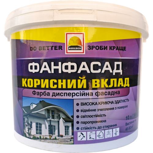 З огляду на умови експлуатації, до фасадної фарби пред'являються підвищені вимоги. BUILDER ФАНФАСАД прекрасно підходить для фарбування фасадів житлових і громадських приміщень. Вона дає рівномірне міцне покриття, стійке до агресивних атмосферних впливів. Колір покриття залишається стабільним, незважаючи на вплив вологи і прямих сонячних променів. Фарба не розтікається, наноситься щільним однорідним шаром і забезпечує довговічну зовнішню обробку. Склад фарби не містить шкідливих речовин, вона може використовуватися не тільки для зовнішніх, але і для внутрішніх робіт.