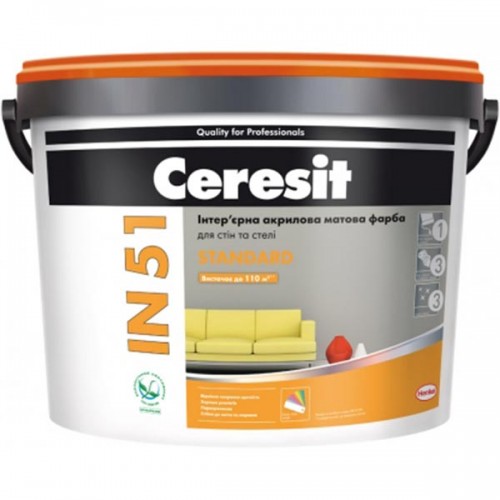 Акрилова фарба Ceresit IN 51 призначена для фарбування поверхонь будівельних конструкцій і елементів усередині будинків по мінеральних (бетон, цегла, цементно-піщані штукатурки, гіпсові штукатурки та плити) і органічних основах (шпалери, стеклохолст, пінополістирольні плити, фанера, деревостружкові та деревоволокнисті плити) в приміщеннях з нормальним експлуатаційним навантаженням. Допускається миття з використанням побутових миючих засобів. Можливе багаторазове ремонтне перефарбування без видалення попереднього шару. Не застосовувати для забарвлення підлоги. Дозволена для використання в будівлях медичного призначення та дитячих установах.