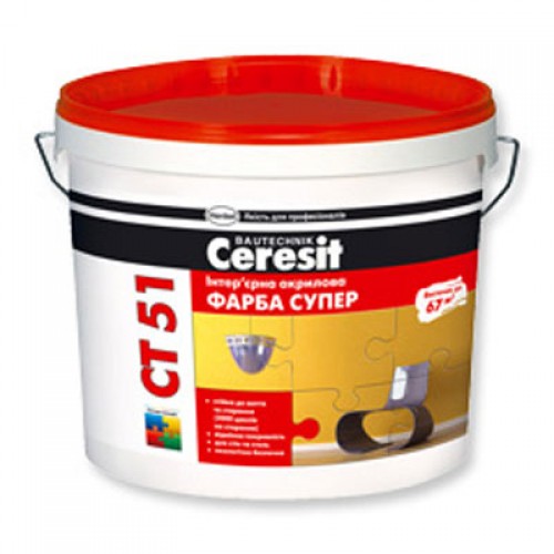 Акрилова фарба Ceresit CT 51 призначена для обробки поверхонь будівельних конструкцій і елементів усередині будинків по мінеральних основах(бетон, цегла, цементно-піщані штукатурки, гіпсові штукатурки, плити) і органічних основах (шпалери, полістирольні плити, фанера, деревостружкові та деревоволокнисті плити) в приміщеннях нормального експлуатаційного навантаженням. Допускається використання побутових миючих засобів. Можливе багаторазове ремонтне перефарбування без видалення попереднього шару. Не застосовувати для фарбування підлоги. Вододисперсійна, стійка до миття фарба для внутрішніх робіт.