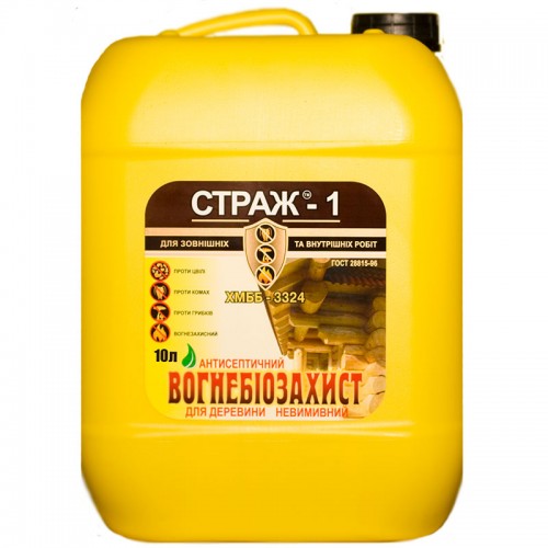 Вогнебіозахист "Страж-1" антисептик для дерева Захищає від займання, образування цвілі, гниття, від грибків та комах-шкідників Глибоко проникає в деревину не перешкоджає фарбуванню і склеювання деревини Вогнебіозахист "Страж-1" ХМББ-3324, являє собою водорозчинний 4-х компонентний важко вимиваючий вогнебіозахисний препарат для зовнішніх і внутрішніх робіт. Антипірен використовується в якості захисного просочення, яким обробляються: стовпи; шпали; паркани; підлоги; крокви; палі; віконні рами та дверні отвори і т.д.