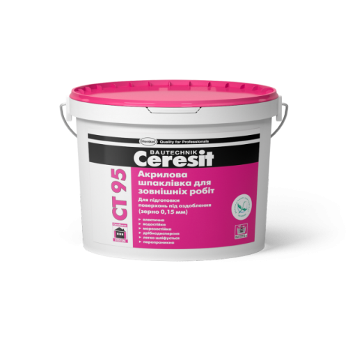 Шпаклівка акрилова Ceresit СТ 95 для зовнішніх робіт проводиться з розміром частинок наповнювача не більше 0,15 мм. Ceresit СТ 95 призначена для шпаклювання і остаточної підготовки мінеральних поверхонь фасаду під оздоблення. Найбільш ефективна на поверхні з низькою міцністю і високим водопоглинанням. Може використовуватися для відновлення захисно-декоративного шару в системах теплоізоляції, а також для ремонту дрібних тріщин у зовнішніх стінах.
