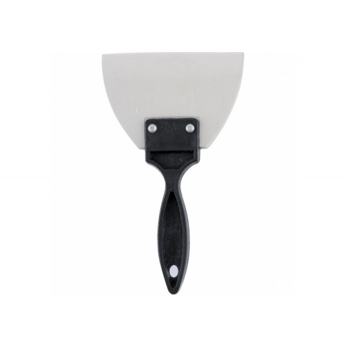 Шпатель гумовий білий з ручкою. Полотно шпателя виготовлено з білої гуми и кріпіться до пластмасової ручки заклепками. Шпатель зручне використовуват для заповнення швів настінної плитки.