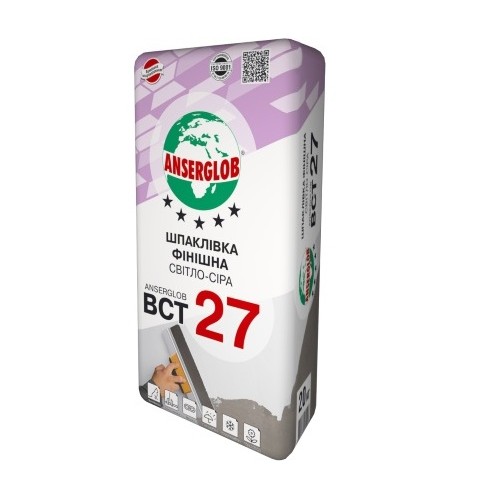 Шпаклівка фінішна світло-сіра ANSERGLOB ВСТ 27 - суміш з високою пластичністю призначена для виконання остаточної тонкошарової високоякісної обробки всіх видів мінеральних недеформованих основ. Ефективна при ремонті тріщин, раковин, виїмок і інших дефектів на поверхні основ глибиною до 4 мм. Суміш шпаклювальна фінішна ANSERGLOB ВСТ 27 застосовується всередині і зовні будинків, у виробничих і житлових приміщеннях, а також в умовах підвищеної вологості. Рекомендується для декоративного оздоблення фасадів та інтер'єрів зі створенням різних фактур.