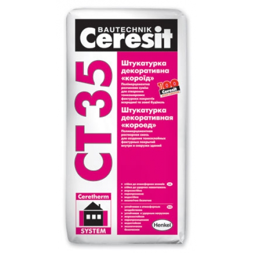 Штукатурка Ceresit СТ 35 призначена для влаштування декоративних тонкошарових штукатурних покриттів з фактурою «короїд» при внутрішніх і зовнішніх роботах, в т.ч. при обробці фасадів будівель. Поверхня штукатурки має фактуру, покреслену борознами ( «поїданню короїдом»).